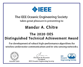 On behalf of the Society it is an honor to present this year’s Distinguished Technical Achievement Award to Mandar A. Chitre for development of robust high-performance algorithms for wireless underwater communication and in-situ sensing networks.