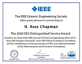 On behalf of the Society it is an honor to present this year’s Distinguished Service Award to N. Ross Chapman for his service as Editor-in-Chief of the IEEE Journal of Oceanic Engineering (2012-2017), Chair of the OES Chapter Victoria BC, Chair the OES Fellow Evaluation Committee (2017), and for his contributions to the governance of the Society as an elected member of the Administrative and Executive Committees.