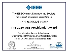 On behalf of the Society it is an honor to present this year’s Presidential Award to Carl Michael Pinto (Mike) in recognition of his extensive support and financial management of all OCEANS conferences starting with his service as Finance Chair of OCEANS 2016 Monterey. That works out to 10 OCEANS conferences so far, plus several upcoming conferences. Let’s not forget that 2020 had 3 events: OCEANS 2020 Singapore, OCEANS 2020 Gulf Coast, which merged and morphed into Global OCEANS 2020: Singapore – U.S. Gulf Coast, all with complicated financial and contractual procedures.