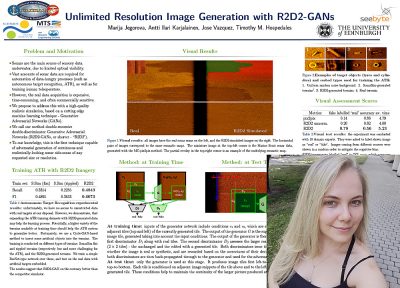 Abstract—In this paper we present a novel simulation technique for generating high quality images of any predefined resolution. This method can be used to synthesize sonar scans of size equivalent to those collected during a full-length mission, with across track resolutions of any chosen magnitude. In essence, our model extends Generative Adversarial Networks (GANs) based architecture into a conditional recursive setting, that facilitates the continuity of the generated images. The data produced is continuous, realistically-looking, and can also be generated at least two times faster than the real speed of acquisition for the sonars with higher resolutions, such as EdgeTech. The seabed topography can be fully controlled by the user. The visual assessment tests demonstrate that humans cannot distinguish the simulated images from real. Moreover, experimental results suggest that in the absence of real data the autonomous recognition systems can benefit greatly from training with the synthetic data, produced by the R2D2-GANs.
