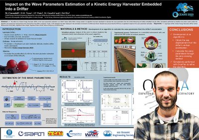Abstract—The effect of a Kinetic Energy Harvester (KEH) on the wave parameters estimation at a WAVY Ocean (WO) drifter is being studied. An algorithm has been developed to calculate the wave parameters from the Inertial Measuring Unit (IMU) embedded on the drifter. Simulations performed by OrcaFlex have been used to refine the algorithm and assess the measurement errors derived from the drifter response. Finally, a WO prototype has been deployed in the controlled environment of CIEM wave flume. Results prove that the KEH has no significant impact on the wave parameter estimation.
