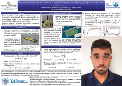 Abstract—This work addresses the problem of determining a low cost method to identify the dynamic parameters of the surge motion model for an Autonomous Underwater Vehicle (AUV) utilising experimental data. With this goal, various sea tests were planned and carried out, involving minimal equipment. In particular, an acoustic tracking system composed of passive Direction of Arrival (DoA) sensors was used to track the vehicle while moving underwater. Such dataset was exploited to identify the values of the dynamic parameters with a best fit approach. Eventually, the comparison between the signals computed through the identified model and the experimental data has been reported as a preliminary evaluation.