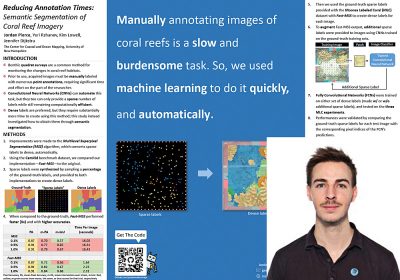 Abstract—Benthic quadrat studies requiring time-intensive manual image annotation are currently a critical component of assessing the health of coral reefs. Patch-based image classification using convolutional neural networks (CNNs) can automate this task by providing sparse labels, but remain computationally inefficient. This work extends the idea of automatic image annotation by using fully convolutional networks (FCNs) to provide dense labels through semantic segmentation. We present an improved version the Multilevel Superpixel Segmentation (MSS) algorithm, which repurposes existing sparse labels for images by converting them into the dense labels necessary for training a FCN automatically. Our implementation—Fast-MSS—is demonstrated to perform considerably faster than the original without sacrificing accuracy. To showcase the applicability to benthic ecologists, we validate this method using the Moorea Labeled Coral (MLC) dataset as a benchmark. FCNs are evaluated by comparing their predictions on test images with the corresponding ground-truth sparse labels. Our results indicate that FCNs’ perform with accuracies that are suitable for many ecological applications, and can increase even further when trained on dense labels augmented with additional sparse labels provided by a patch-based image classifier. The contributions of this study help move the field of benthic ecology towards more efficient monitoring of coral reefs through entirely automated processes.