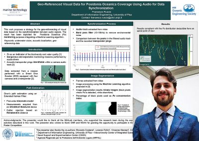Abstract—The supervision of underwater areas is essential for the preservation of marine ecosystems. In the Italian context, Professional divers of Environmental Protection Agencies are periodically involved in monitoring activities that are repetitive, dangerous, and expensive. The Ligurian Regional Agency for the Environmental Protection (ARPAL) and the University of Pisa (UNIPI) are collaborating towards the employment of robots and ICT tools to improve the monitoring activities in terms of safety, cost and time effectiveness. This paper reports a strategy to geo-reference underwater visual data using audio for data synchronization. The work refers to a visual dataset acquired by a Smart Dive Scooter (SDS) during a Posidonia Oceanica (Po) monitoring activity in front of the Ligurian Coast. The proposed strategy concerns the synchronization between the audio track recorded by a camera and the transponder pings adopted for the SDS acoustic positioning system. The paper also reports the exploitation of the geo-referenced optical data for the identification of Po meadow over the mission area using a Machine Learning algorithm. The results are very promising and can lead to an accurate geo-referenced identification of Po and the reconstruction of the surveyed area.