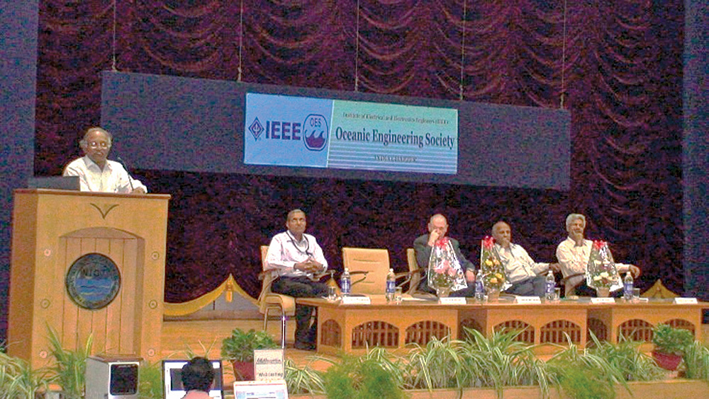 Inauguration of IEEE OES India. Dr. Kathiroli (then Director of NIOT) speaking, on the dais – Dr. Atmanand, Dr. James Mc Farlane, Dr. Goel (then Secretary Ministry of Earth Sciences, Govt. of India), Prof. Pillai
