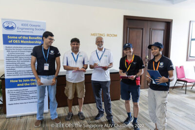 IEEE OES has always been a regular supporter of SAUVC in terms of sponsorship. Apart from OES, SAUVC 2022 was sponsored by Mathworks, Kongsberg, Evologics, BlueRobotics, SubCTech, Nortek, IEEE Young Professionals, National University of Singapore and Office of Naval Research Global (ONRG). Some of these sponsors had supported us towards the 2020 event, which did not materialize, and thus the sponsorship funds were carried over to the 2022 event. SAUVC is run solely on sponsorship, and we would like to sincerely thank all our sponsors for their support. Additionally, this year, Kongsberg helped us out with 5 of their representatives attending the event and helping with judging during the qualifiers. Representatives from Kongsberg and ONRG also interacted with the teams.