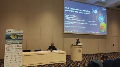 Figs. 6 and 7 show images taken during the keynote speech by Roberto Sabia entitled “ESA Ocean Remote Sensing Activities and Perspectives.”