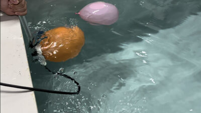 MakiComet can move in surge, heave, pitch, and yaw by four thrusters. Its acrylic hull, which serves as a buoyant body, is located on both sides. At the same time, the center of gravity is set lower in the middle to maintain stability in the roll direction. As sensors, we used a depth sensor for estimating depth and a camera module for recognizing balloons in the water. The AUV was also equipped with leg parts for landing on the pool floor. Additionally, it featured another thruster without a shaft, as mentioned in the previous section, at the top front of the AUV, and a pushpin was attached at the center of the thruster. Thanks to the suction power of the new thruster, MakiComet was able to suction a balloon [Figure 4], and burst the balloon reliably. It’s also worth noting that the power didn’t disturb MakiComet’s movement or posture maintenance.