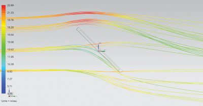 Stress analysis was completed using wind loading from Siemens NX computational fluid dynamics (CFD) software. This was in addition to approximations from empirical studies on wind tunnel experiments on solar panels and rougher engineering approximations, which were used to validate the CFD results. A number of critical wind loading cases were considered, for example the loading from a 40 knot tailwind acting on the rear of the panel (see the velocity streamlines below). Depending on the orientation of the panel to the wind, the Bernoulli effect can become significant, in this case pulling up on the back of the panel.