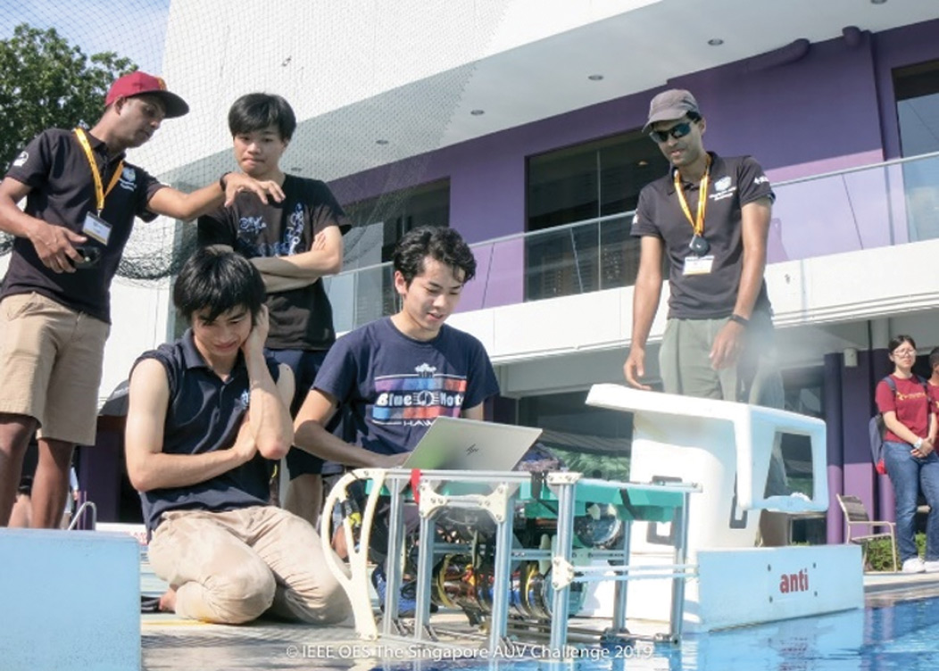 After winning at OTO’18, our focus moved to SAUVC (Singapore Autonomous Underwater Robots Challenge), one of the major international competitions of underwater robots. It did not take a long time to decide to participate in the competition. We were eager to join SAUVC, but at that time, we did not have enough funds. We had started to give up on joining the competition when, fortunately, the OES Japan chapter started a scholarship for SAUVC. We applied for the scholarship and were finally selected. We would like to say a big thanks to the OES Japan chapter. SAUVC consists of three rounds. The first round was a video review of the AUVs to see if they worked correctly. 61 teams applied to the first round and 15 teams were selected. Our team made it through this and was qualified to join the second round held in March 2019 in Singapore. A lot of our efforts went to improve the stability of the control, making use of our experience in OTO’18. In the second round, the time to get through the gate was contested. Each team put their effort to reduce the time to get through the gate. Our AUV was able to pass through the gate, but not fast enough to advance to the final round (Figure 4, Figure 5).