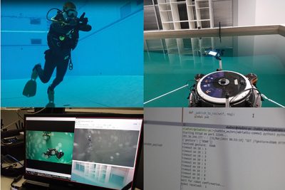 First remote trials in the new LABUST facilities – a diver in a pool in Auckland on the top left, the D2 AUV on the top right, a control and camera streaming PC on the bottom left and right