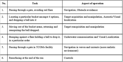 The remaining tasks in this edition mirrored those of the previous one, following a two-tiered structure comprising a qualification round and a final round. To secure qualification, the AUV had to navigate from the designated starting line through the qualification gate without surfacing, contacting the bottom or walls, or the gate itself. The top 21 teams, achieving the swiftest times in the qualification round, progressed to the final round. During this stage, AUVs garnered points by executing a range of challenges designed to assess their abilities in acoustic and visual navigation, positioning, actuation, communication, and robotic manipulation. The ensuing table outlines the various functional capabilities under examination and their corresponding tasks.