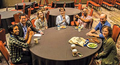 Young Professionals meet during lunch at OCEANS Charleston, 2018. From left to right Hari Vishnu (YP Boost 2019–2020), Frederic Maussang (YP chair), Katherine Woodard Weathers, Fausto Ferreira (AdCom), Shyam Madhusudhana (AdCom), Christopher Whitt (AdCom), and Brandy Armstrong (AdCom).