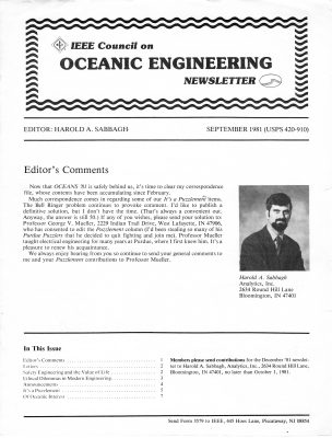 Harold (Hal) Sabbagh was the NL editor from 1978 to 1990. In addition to including calls for papers for OCEANS and other conferences, the various activities of the COE, and the oceans-related activities of COE’s (society) members, the NL published technical articles of general interest to its readers. One such feature article was “An Overview of the U.S. OTEC (Ocean Thermal Energy Conversion) Development Program,” by Robert Cohen from the U.S. Department of Energy, in the March 1979 issue. The June 1982 issue included the full Technical Program for the OCEANS 82 Conference. The NL contained the “It’s A Puzzlement” series with puzzles to challenge readers. One such example (from the December 1981 issue) is the “Chinese Rug Puzzle”: A rug that is 10 ft by 10 ft is to be cut on a continuous line. The two parts are to be combined with a second rug that is 1 ft by 8 ft to form a single rug that is 9 ft by 12 ft. Show how to make the cut. Those of you who choose to test your skill can compare your answer to that in the March 1982 issue (linked from the OES website, Publications, OES Beacon Newsletter, Recent and Past Issues, Past Issues (pdf)). Hal Sabbagh had an entertaining sense of humor. In his last issue he said: “I am retiring as OES Newsletter editor, so it is my duty to reminisce. When I assumed this position in 1978, the Chicago Daily News had just ended publication, and this past year the Los Angeles Herald-Examiner went belly-up. Hence, of the three great American newspapers, only the OES Newsletter has survived the last dozen years. (Yes, I know that the OES Newsletter is a transnational publication, but calling it an American newsletter fits the context better, don’t you think?)” Given all the other newspapers that have hit the skids since then, I guess the staying power of the OES Newsletter is even more remarkable today, don’t you think?