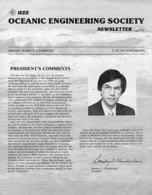 The newsletter (NL) of the Oceanic Engineering Society (OES) is one of only two activities of the OES that have existed over the full 50 years of the Society’s existence (the other being the OCEANS Conference). The NL began in simple form in 1970 without a designated continuing editor until 1973 when Donald Bolle from Brown University assumed that role. Professor Bolle continued as NL editor until 1978 when he relinquished it to became the founding Editor-in-chief (EIC) of the new IEEE Journal of Oceanic Engineering (JOE). At that point, the initial form of the OES was the Oceanography Coordinating Committee (OCC), an organizational form allowed by IEEE to sponsor conferences and have a newsletter but did not allow it to produce an archival journal. By 1973, The OCC had transitioned into the Council on Oceanic Engineering (COE), a form which was allowed by IEEE to have such a journal. The members of the COE were other IEEE societies, not individual IEEE members. With the need to organize OCEANS conferences at various locations, the desire for member individuals and local chapters was fulfilled by transitioning from a council to a society to become the Oceanic Engineering Society on January 1, 1983, with Stan Chamberlain as its initial President.