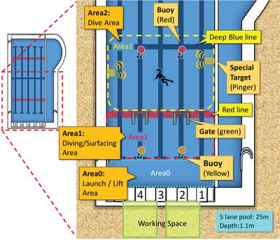 Bonus points are awarded for technically advanced missions (bonus challenges) such as “positioning and approaching the underwater acoustic lighthouse” and “raising a medal marking completion of all the missions”. Teams should try to undertake these challenges. After 4 round trips, the AUV should surface in Area0 or Area1 to indicate completion of the missions. Each team representative should then declare to the referee that they have reached the goal.