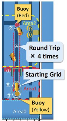 As shown in Fig. 1, the inside of the swimming pool is divided into Area0, Area1 and Area2. Starting from Area0, four round trips should be made between Area2. Area1 has a yellow buoy and Area2 has a red buoy so that a round trip between these buoys is a straight course. The following are the regular missions for each Area.