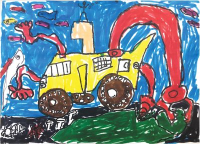 Fig. 8. Grand Prix of Dream Underwater Robot Illustration Contest (Lower grade group: “Robots that find and dig undersea resources”)