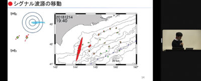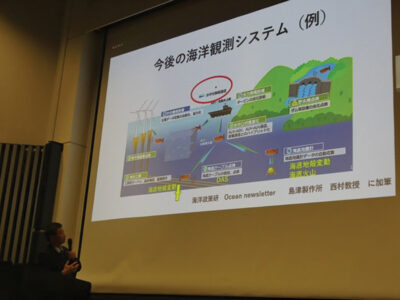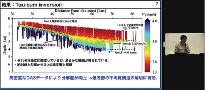 In the keynote speech on “The Future of Seafloor Observation Research,” Professor Yoshiyuki Kaneda of Kagawa University spork about the importance of not only monitoring research using seafloor observation networks consisting of optical cables and various observation sensors, but also comprehensive monitoring through AUVs and underwater drones, as well as seafloor crustal monitoring including a long-term borehole monitoring system.  The following seven lectures introduced the development of a long-term borehole monitoring system and its operational cases, and applications of optical cable sensing in science such as seismic observation.