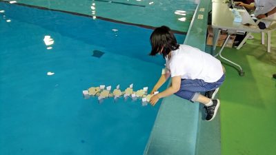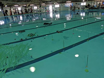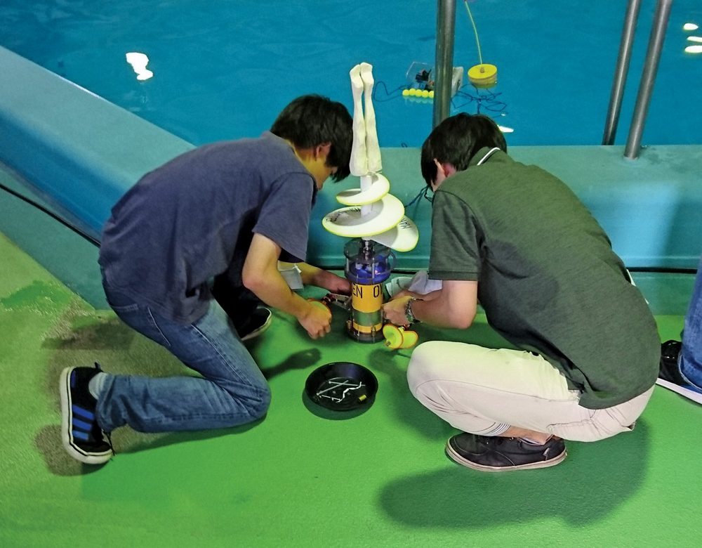 The junior section is a competition for junior high school students, high school students and technical college students. Underwater robot kits are provided free of charge to the teams entered one month before the tournament. Participants assemble and modify them before the competition. The task in this competition is collecting cans. Each team is evaluated based on how many cans can be collected within the limited time. Higher scores can be expected if cans can be collected from a field simulating seaweed.