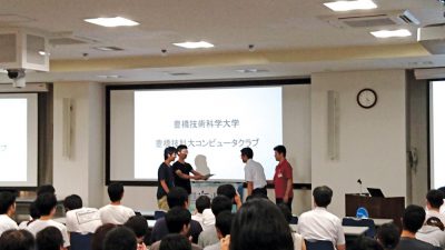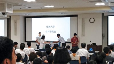 The awards ceremony. Top three or two teams in each section were awarded. The top left: Shinshu University, which won the first prize in the free style section. The top right: Toyohashi University of Technology, which won the first prize in the AI challenge section. The bottom left: Shibaura Institute of Technology Senior High School, which won the first prize in the junior section. Special award was also given to one team shown in the bottom right.
