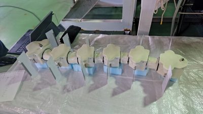 gen4 has 4 thrusters which consist of one surge thruster, one heave thruster, and 2 sway thrusters. Pressure hulls for thrusters and computers are separated. It is designed to launch a handset. The robot is covered with a plastic plate to reduce the water resistance so that it can move forward faster. The thruster for forward movement is being improved so that large power can be used.