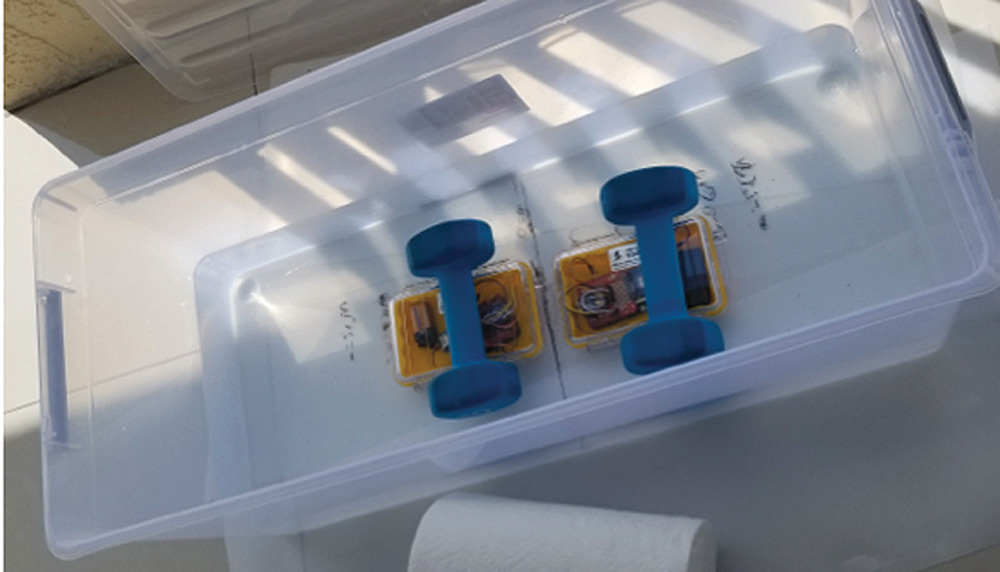 No testing tank, no problem! A plastic storage bin and some seawater creates a great setup to start benchmarking underwater wireless transmission.