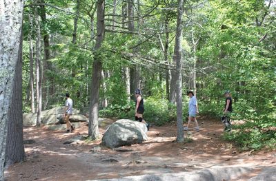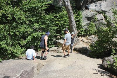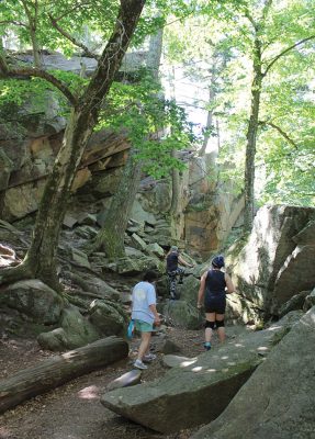 Purgatory Chasm in Sutton, MA, is a mad scramble of boulder caves and overhanging precipices. The chasm may owe its existence to a burst ice dam and a raging torrent of glacial meltwater that ripped up blocks of granite bedrock roughly 14,000 years ago at the close of the last Ice Age. Or maybe not. However it formed, our mad scramble through the maelstrom of the chasm floor and back over and along the cliffs above was in turn coolly refreshing and warmly satisfying.