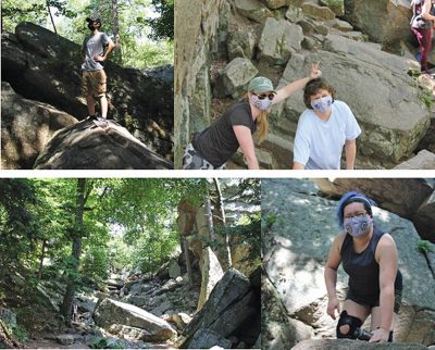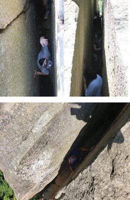 Several views of our masked and socially distant progress along the granite block strewn floor of the chasm can be seen in Figures 1 and 2. The bottom of the chasm is up to 25 meters below the overhanging cliffs, and reasonably cool and shaded, even on a hot summer day.