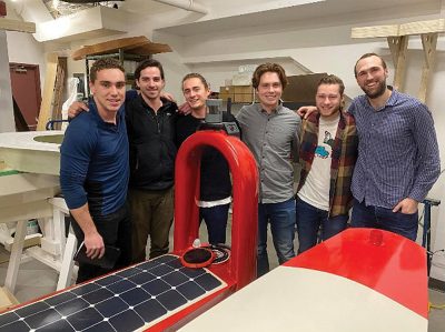 Figure 1: Team photo with the Open Ocean Robotics autonomous surface vessel. Names left to right: Robert Scarth, Nic Mercier, Bret Davis (OES student member), Braidon Joe, Josh Stang, and Ryan Foxall