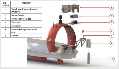 The winch uses a 12 V brushless DC motor to drive a spooling system (details in Figure 3). The line is neatly arranged onto the spool using a self-reversing diamond lead screw.  To avoid line tangling, a tensioning device was implemented at the end of the static arm. This consisted of two counter rotating pulleys, mounted vertically on top of one another, with a downward force between them provided by springs. Line counting is done using a magnet and Hall effect sensor mounted to the tensioner. A 3D printed cup was mounted at the end of the static arm to guide sensor docking, to provide a secure location for the sensor when not in use, and to position the sensor against an inductive charging plate. Highly corrosion resistant materials, such as stainless steel and various plastics, were chosen due to the saltwater environment. Rapid prototyping methods, such as laser cutting and 3D printing, are central to the design methodology to reduce costs and production time.