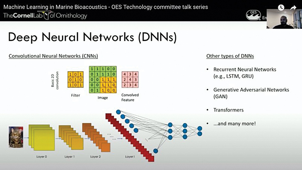 Dr. Shyam Madhusudhana gave a webinar on the topic Machine learning in marine bioacoustics on 21 July, 2021. Dr. Madhusudhana is a postdoctoral researcher at the K. Lisa Yang Centre for Conservation Bioacoustics (CCB) within the Cornell Lab of Ornithology. His research involves developing deep-learning techniques for realizing effective and efficient machine-listening in the big-data realm, with applications in the monitoring of both marine and terrestrial fauna. He is actively associated with OES as Coordinator of Technology Committees and as the co-Chair of the Student Poster Competitions at the biannual OCEANS conference. This talk was the second in the series of talks organized by the Technology Committee on Data Analytics, Integration and Modelling (DAIM) related to Machine Learning and its application to Oceanic Engineering. The first talk in this series, Introduction to machine learning in acoustics: theory and applications, was given by Dr. Michael Bianco, Assistant Project Scientist, Marine Physical Laboratory, University of California San Diego (UCSD), La Jolla, CA, USA. This second webinar, given by Dr. Madhusudhana, was also well attended, like the first one, by approximately fifty attendees online. The recordings of these two talks are available at the OES Youtube channel (https:// www.youtube.com/ channel/ UC6wjVnDY2-BmzdS8LzxrdHQ)