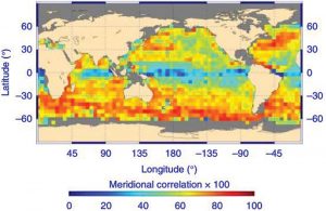 Figure 1. Reproduced from Sudre et al. (2013): correlation of V-component of current estimated from satellite data (filtered for time scales > 30 days)with in situ drifter measurements.